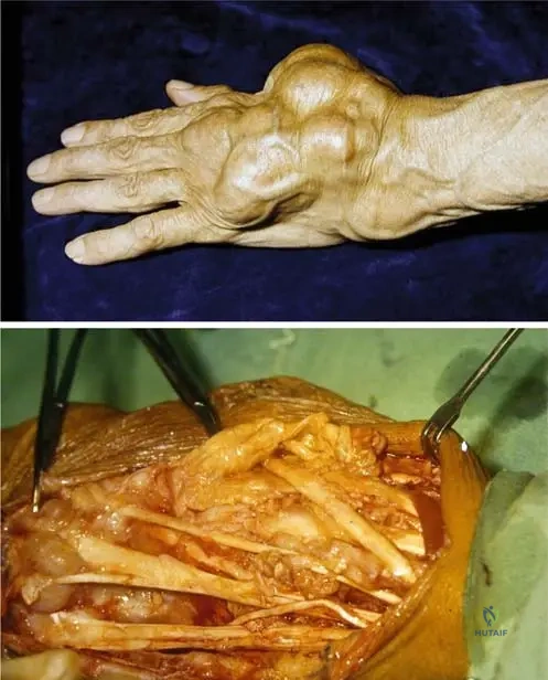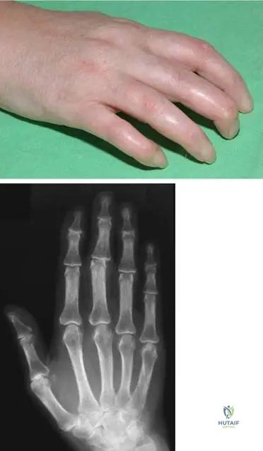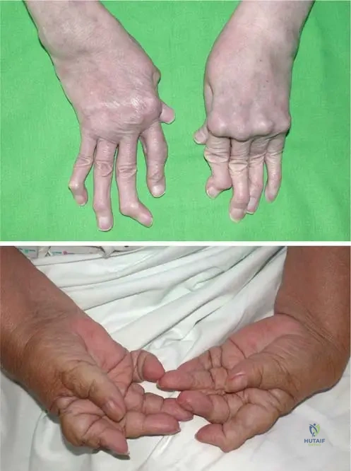 A 58-year-old female with long-standing rheumatoid arthritis experiences progressive hand deformities, including tendon ruptures and joint subluxations. An intraoperative image shows hypertrophic synovial tissue penetrating into the tendons.