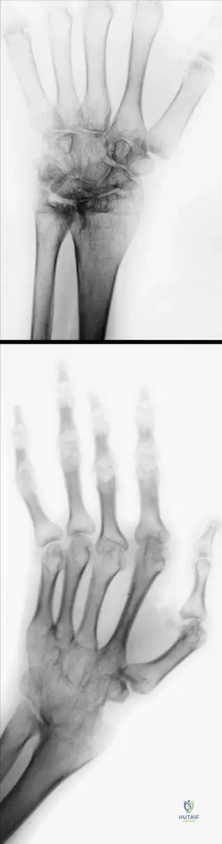 A 62-year-old female with severe, long-standing rheumatoid arthritis presents with significant forefoot pain and difficulty wearing shoes. Clinical examination reveals severe hallux valgus, hammer toes, and a flat foot with lateral deviation of the lesser toes. Radiographs are obtained to assess the extent of joint damage.