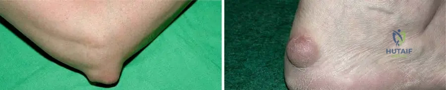 Rationale: Rheumatoid nodules are typical extra-articular manifestations of RA and are most commonly found subcutaneously on the extensor sides of limbs, especially over the olecranon, Achilles tendon, and other areas subjected to pressure. The main distractor, B, is incorrect as nodules typically appear on extensor surfaces, not flexor surfaces.
