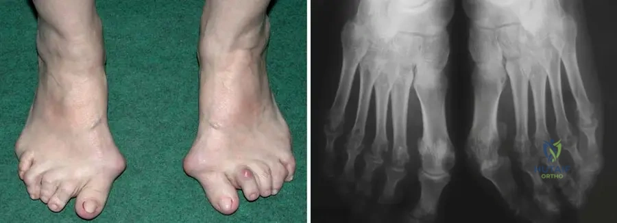 Rationale: The described deformities—hallux valgus, hammer toes, MTP joint destruction, flat foot, and fibular deviation of toes—are classic and severe forefoot manifestations of rheumatoid arthritis. These result from chronic synovitis, ligamentous laxity, and bone erosion. The main distractor, B, describes a pes cavus deformity, which is the opposite of the flat foot often seen in RA, and claw toes are different from hammer toes, though both involve toe contractures.