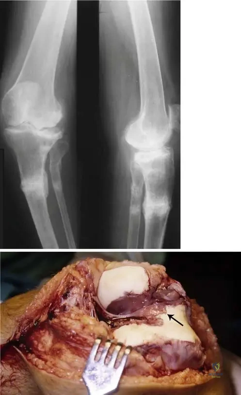 Rationale: In the early stages of PVNS, radiographs often show periarticular lucencies and considerable effusions (soft tissue swelling). The clinical photograph (Fig. 10.5) shows visible swelling of the knee. Main Distractor: A) Extensive subchondral bone cysts and joint space narrowing. While these can occur in long-standing PVNS due to destructive changes and secondary degeneration, periarticular lucencies and soft tissue swelling are more characteristic early findings.