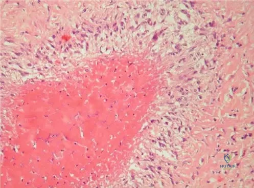 A 60-year-old male with long-standing, seropositive rheumatoid arthritis presents with palpable, firm, non-tender subcutaneous nodules over his olecranon processes. A biopsy of one of these nodules is performed.