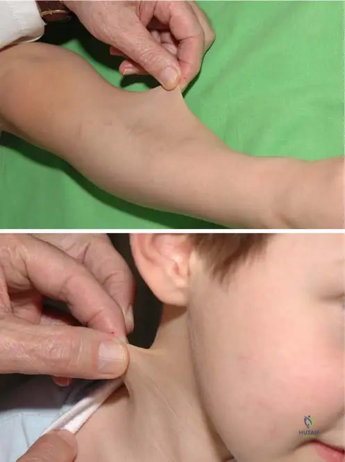 A 1-month-old infant is found to have polydactyly of the right hand, specifically an extra digit on the ulnar side (postaxial polydactyly). The extra digit is small, rudimentary, and attached by a narrow pedicle.