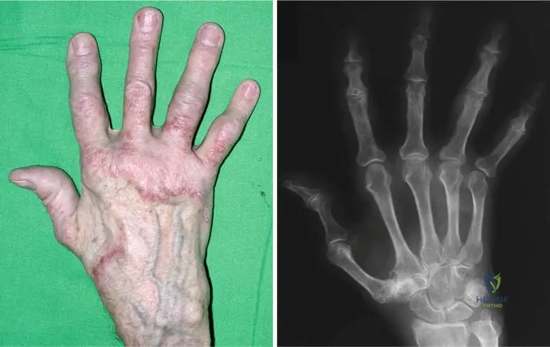 Rationale: The text mentions, "Destructive arthritis of distal joints may be manifest in so-called sausage fi ngers." This "sausage finger" appearance is clinically known as dactylitis, which is a characteristic feature of psoriatic arthritis. Synovitis and tenosynovitis are components but dactylitis describes the overall appearance. Cellulitis is an infection and bursitis is inflammation of a bursa.