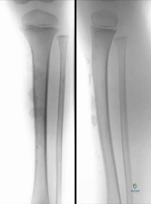 An 8-year-old boy with a history of dermatomyositis presents with stiffness and limited range of motion in his extremities. An anteroposterior and lateral radiograph of his thigh is obtained.