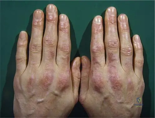 Rationale: Figure 12.19 clearly labels the depicted lesions as "Gottron’s papules over the metacarpophalangeal joints (violet-colored skin pigmentation on the extensor surface of small joints)." Option D, Mechanic's hands, is another skin finding in myositis but is not the specific term used to describe the lesions shown in the image or the primary characteristic finding on the MCP joints.