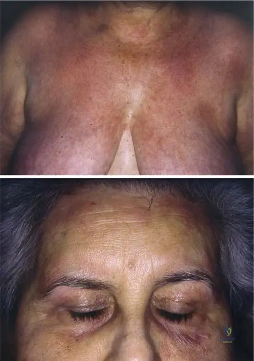 A 62-year-old patient presents with new onset proximal muscle weakness and a characteristic rash over her breast, as depicted in the image. This rash is a recognized cutaneous manifestation of dermatomyositis.