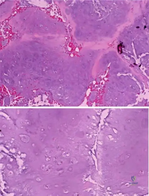 A pathologist is examining a biopsy specimen from a suspected enchondroma in a 17-year-old patient.