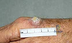 "Observe this invasive SCC on the right second MP joint area in a kidney-pancreas transplant patient, a classic presentation in an immunocompromised individual."
