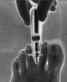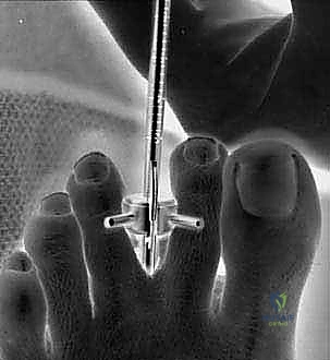 TECH FIG 5 • Intraoperative view of knife mounted to scope in position in cannula ready to enter second web space and transect the transverse intermetatarsal ligament.