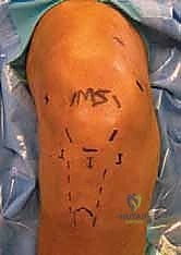 We begin by marking our portals on the skin. A complete synovectomy typically requires five or six portals to ensure thorough access to all compartments.