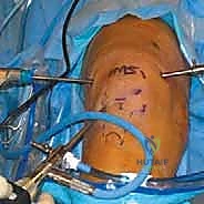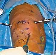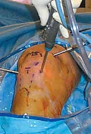 This image illustrates the superolateral portal being established, ready for instrument insertion.