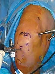 - Arthroscope in Inferolateral, Shaver in Inferomedial: We return the arthroscope to the inferolateral portal, and keep the shaver in the inferomedial portal.