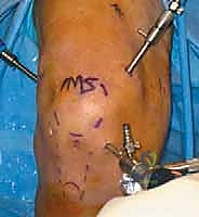 Observe the typical portal markings on this right knee. Accuracy here is crucial for optimal visualization and instrument maneuverability.
