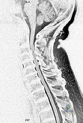 FIG 2 • B. Sagittal T2-weighted MRI showing multilevel cervical disc protrusions and circumferential stenosis at C3–4, C4–5, and C5–6, resulting in cord deformation. Cord signal changes can be seen at C3–4 and C4–5, indicative of cord damage.