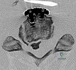 FIG 2 • D. Axial CT image demonstrating vertebral canal compression from large ossified posterior longitudinal ligament.
