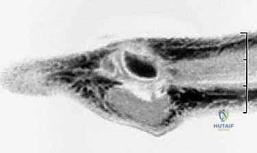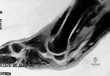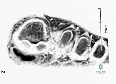 Figure 2: A sagittal MRI view of the sesamoid-metatarsophalangeal complex, illustrating the increased stress across the tibial sesamoid during MTP dorsiflexion.