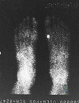 Figure 5A: Triple-phase bone scan showing increased uptake in the tibial sesamoid region on an AP view of bilateral feet.