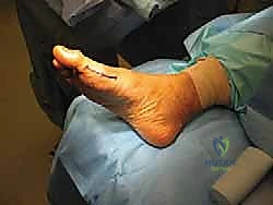 Figure 8: Intraoperative view showing the planned incision line and the natural external rotation of the foot, optimizing medial forefoot exposure.