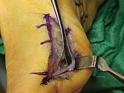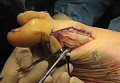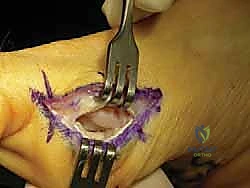 Figure 4: Initial incision to separate the flexor hallucis brevis in line with its fibers, exposing the sesamoid.