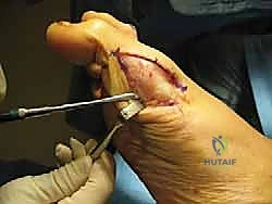 Figure 3: The tip of a Freer elevator positioned underneath the tibial sesamoid, prior to careful dissection of the flexor hallucis brevis complex. Note the longitudinal capsulotomy has already been repaired.