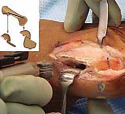 Now, using an oscillating saw, we will resect the medial eminence. The key here is precision: resect it 1 mm medial to the sagittal sulcus.