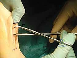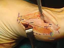 As we deepen the incision through the skin and subcutaneous tissue, be acutely aware of the dorsal medial cutaneous nerve. Use blunt dissection with Metzenbaum scissors to carefully identify and retract this nerve dorsally and protect it throughout the procedure. Any direct trauma or excessive traction can lead to postoperative neuroma or paresthesia.