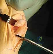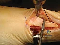 Specifically, we release the tendinous insertion of the adductor hallucis muscle from the fibular sesamoid and the base of the proximal phalanx. We then release the suspensory metatarsal-sesamoid ligaments and make multiple sharp perforations in the lateral capsule at the joint line.