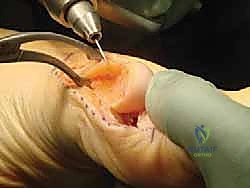 Once the nerve is protected, we sharply incise the medial capsule in a single, longitudinal direction. This provides excellent exposure of the medial eminence of the first metatarsal head.