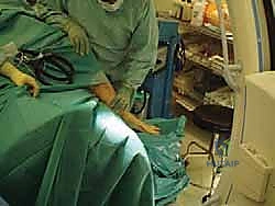 Our patient is positioned supine on the operating table. Crucially, we've placed a sandbag under the ipsilateral buttock. This maneuver internally rotates the hip, ensuring the big toe points directly to the ceiling, providing optimal exposure and alignment for our surgical approach. A thigh tourniquet has been applied high on the thigh, ensuring a bloodless field once inflated. We've also administered prophylactic antibiotics, as per our protocol, to minimize the risk of infection. The foot and ankle are prepped and draped in a sterile fashion, ensuring we have full access to the surgical site and enough room for fluoroscopy.