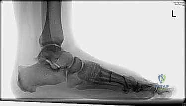 Before closing, we perform a final radiographic assessment using image intensification. We take AP, oblique, and lateral views of the foot, ensuring the foot is flat on the image intensifier plate, mimicking a weight-bearing position.