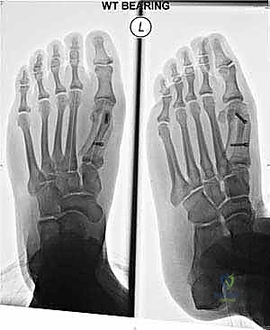 - 5 Weeks Post-Op: We obtain follow-up radiographs to assess the osteotomy for signs of consolidation. If there is adequate radiographic evidence of healing, the patient is instructed to transition from the hard-soled shoe to a wide, comfortable shoe or sneaker. They are encouraged to progress to full weight-bearing as tolerated.