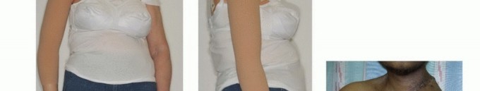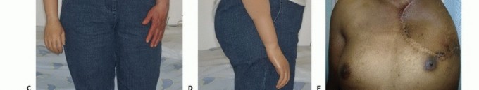 FIG 6: Functional and cosmetic outcomes. Note the typical deformity of the shoulder girdle, the use of a custom-made cosmetic prosthesis, and a healed clinical photograph 5 years post-surgery.