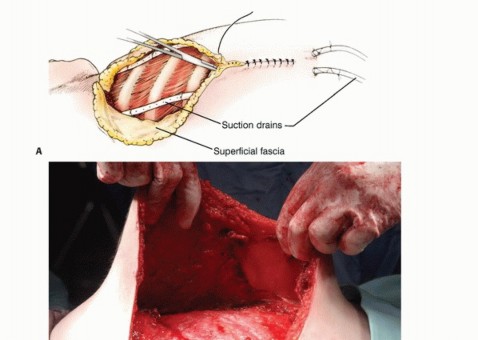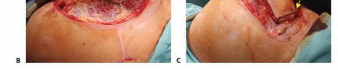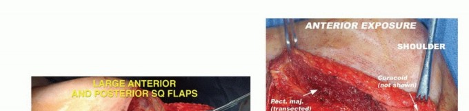 - Flap Ischemia: Usually superficial and marginal because of the good blood supply of the shoulder girdle. It typically resolves spontaneously. Occasionally, there is full-thickness necrosis of the posterior flap. A clear demarcation line appears after 4 to 7 days, after which débridement of the necrotic segment and primary closure are carried out.