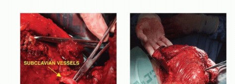 This exposes the posterior chest wall and allows the surgeon to place his or her hand into the axillary space to check for chest wall or intercostal muscle involvement, whereupon the planned amputation can proceed. If there is chest wall involvement, a combined chest wall/forequarter amputation can be performed. An axillary incision is made to connect the anterior and posterior incisions. The entire forequarter is removed after ligation and transection of the brachial plexus and subclavian vessels.