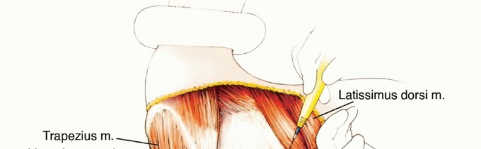TECH FIG 3: Detachment of the scapular attachments of the rhomboids, trapezius, levator scapulae, and latissimus dorsi muscles.