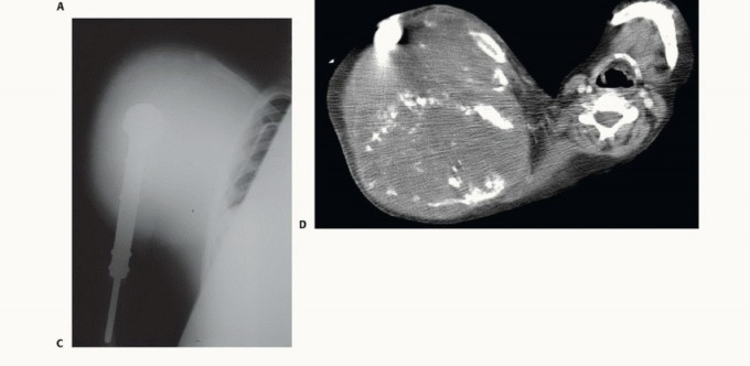 - Large bone tumor (primary bone sarcoma or metastatic lesion) of the proximal humerus and scapula with an extensive soft tissue component and invasion into the shoulder joint and surrounding muscles.