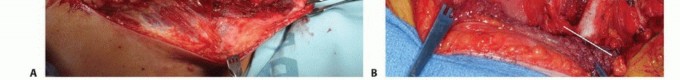 The final shape of the flaps and position of the lines of incision vary according to individual tumor extent. Because of the excellent blood supply to the skin in this region, long anterior or posterior flaps generally survive even though they are closed under considerable tension. Occasionally, large tumors extend to the overlying skin and require en bloc resection with a substantial area of skin. This results in a wound defect that cannot be closed primarily and will require a skin graft or be left for delayed wound closure.