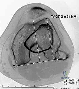FIG 2D. Measurement of the tibial tuberosity–trochlear groove (TT-TG) offset, the transverse distance between the apex of the anterior tibial tuberosity and the center of the trochlear groove. Measurements are made on superimposed axial CT or MRI images.