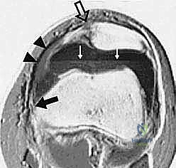 FIG 2F. Transverse gradient-echo image of the knee in a different patient 2 days after lateral patellar dislocation showing partial injury to the femoral origin of the MPFL. The MPFL fibers ( solid white arrow ) are wavy and show longitudinal split, and there is extensive surrounding edema. A complete tear ( open arrow ) is seen in the patellar insertion of the medial patellar retinaculum. A large joint effusion with layering ( black arrows ) is present, consistent with hemarthrosis. Note also the inferior fibers of the VMO ( arrowheads ).
