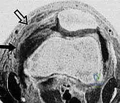 FIG 2E. Transverse gradient-echo image of the knee obtained at the level of the insertion of the adductor magnus tendon 3 weeks after lateral patellar dislocation demonstrates a complete tear of the femoral origin of the MPFL, with MPFL fibers retracted anteriorly ( solid arrow ). Partial injury, with surrounding edema, to the midsubstance of the patellar retinaculum ( open arrow ) also is seen.