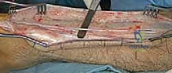 * Proximally: Curve the incision gently centrally and continue it proximally up the posterior midline of the calf, extending superiorly to the estimated proximal extent of the myotendinous junction. This typically means an incision length of 15-20 cm or more, depending on the gap size.