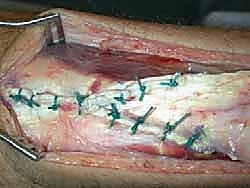 * Debridement: Frequently, a scar pseudotendon or necrotic, nonviable tendon ends are present within the rupture gap. Resect all nonviable tissue back to healthy, bleeding tendon ends. This is crucial for optimal healing and integration of our repair.