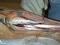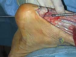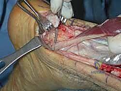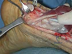 - Surgical Warning: Meticulous dissection is required here. Dissect along the lateral aspect of the FHL tendon as you release its sheath behind the ankle. This keeps your dissection away from the medial bundle, minimizing the risk of inadvertent injury.
