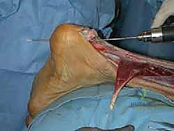 TECH FIG 4 • E. A Beath pin is drilled through the calcaneus immediately anterior to the Achilles tendon insertion.