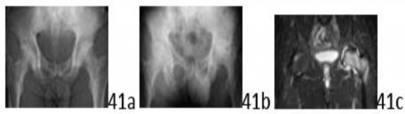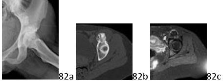 with similar complaints and with a history of a fall 3 months earlier. A current radiograph and MRI scan are shown in Figures 89b and 89c. What is the most likely diagnosis?