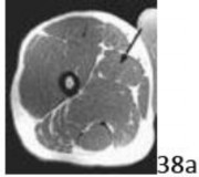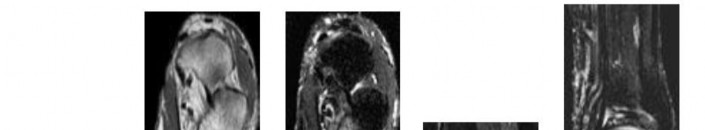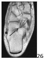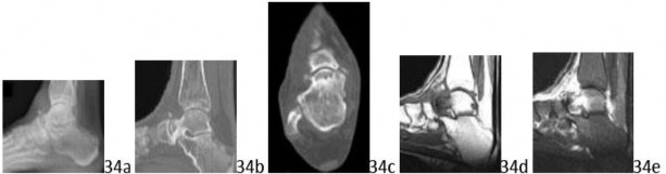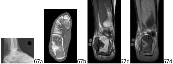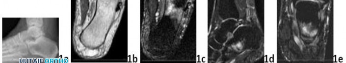 Q 1 1a 1b 1c 1d 1e A 43-year-old female factory worker has had a 6-month history of right plantar and lateral foot pain. She has pain with weight bearing and has difficulty standing at work. Management consisting of physical therapy, time off of work, and fracture boot immobilization has failed to provide relief. She is overweight and, as a result of the pain, cannot exercise to lose weight; thus she is getting worse instead of better. Examination reveals that the foot is not grossly swollen but is diffusely tender over the lateral, plantar, and medial hindfoot. The alignment is normal and the posterior calf muscles are mildly tight. A lateral radiograph is shown in Figure 1a and MRI scans are shown in Figures 1b through 1e. These findings are most consistent with which of the following?