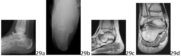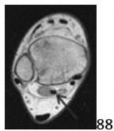 DISCUSSION: The patient has a symptomatic chronic Achilles tendon avulsion (sleeve) rupture. The radiographs show movement of the calcified/ossified tendon away from the insertion and the MRI scan reveals a chronic avulsion of the Achilles tendon from the insertion site. The heterotopic ossification shown is of the distal Achilles tendon. The rupture shown is at the insertion site and not midsubstance or at the musculotendinous junction. The studies are not consistent with the uric acid deposition of gout. The Preferred Response to Question # 89 is 4.
