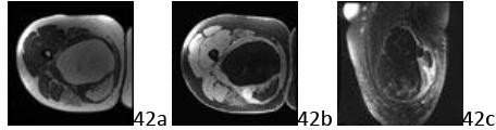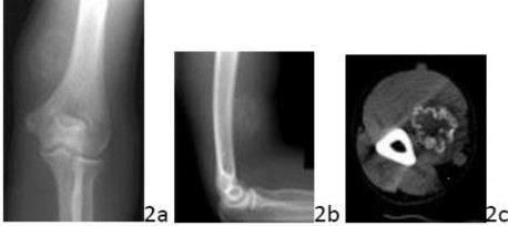Question2 2a 2b 2c A 36-year-old man reports pain and fullness in the medial arm just proximal to the epicondyle. He denies trauma to the arm but noted some soreness following an arm wrestling match a few months ago. Figures 2a through 2c show the radiographs and a CT scan. What is the most likely diagnosis?