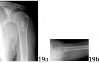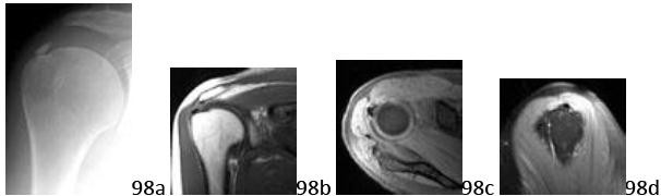 19. # 98a 98b 98c 98d A 35-year-old woman reports the insidious onset of shoulder pain for the past several weeks. Figures 98a through 98d show the radiograph and MRI scans of the shoulder. What is the most likely diagnosis?